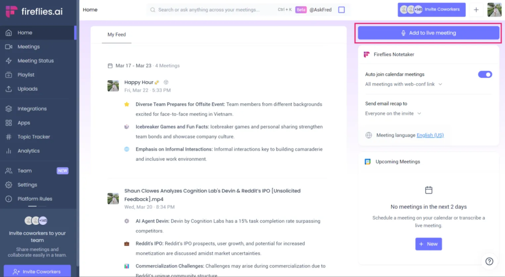 Fireflies.ai is a popular meeting recorder and transcription service that automatically joins, records, and transcribes calls across Zoom, Google Meet, Microsoft Teams, and most dialers. It supports 40+ languages and dialects, offers generous free storage, and is priced attractively for SMBs and mid-market teams. Collaboration is built-in, with live editing, comments, and accurate AI summaries that make recaps easy to share.