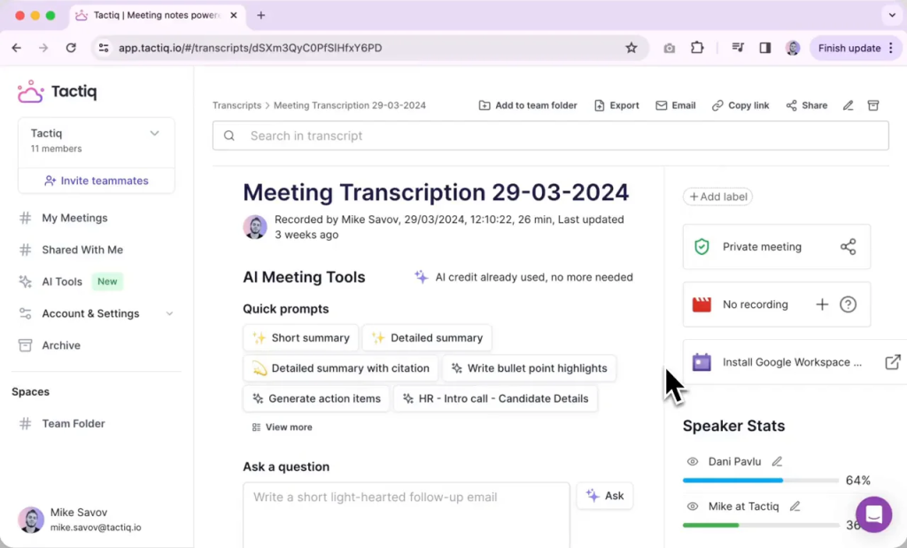 Choose Tactiq if you want instant, in-meeting transcription and post-call summaries with minimal setup, strong multilingual coverage, and practical add-ons like engagement analytics, sentiment cues, and task assignment. It fits teams that live in Meet, Teams, or Zoom and need to turn conversations into Jira tickets or Slack updates immediately, without managing a heavy platform. If speed, simplicity, and real-time clarity matter more than deep sales coaching or multi-meeting analytics, Tactiq is a smart, lightweight pick.