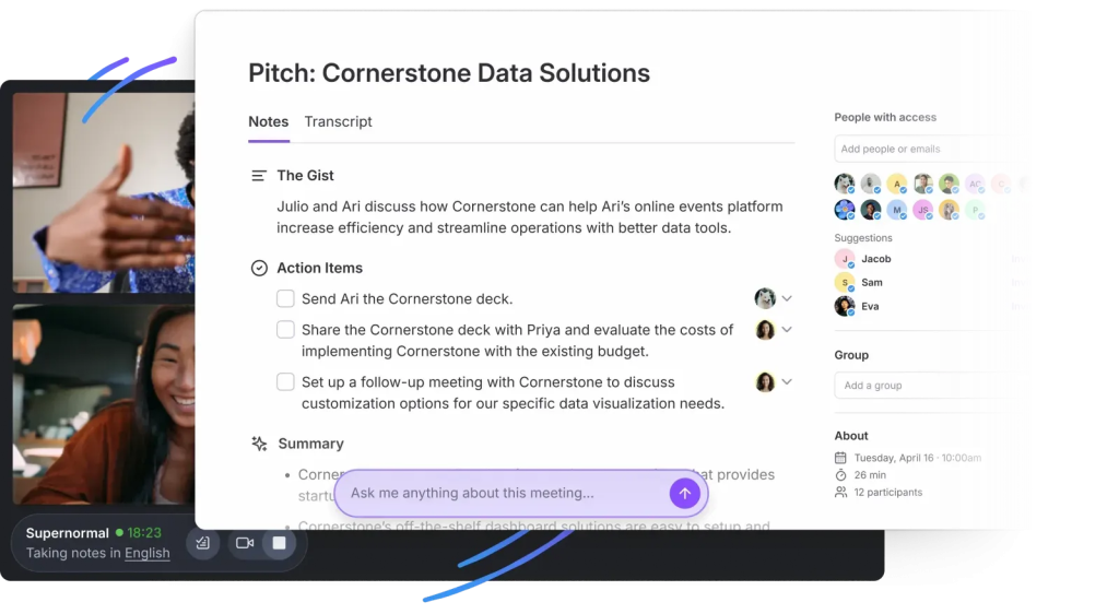 Supernormal is a meeting assistant built to produce consistent, decision-focused documentation for Zoom, Google Meet, and more. It generates real-time agendas, structured recaps, and action items during the call, so teams leave with clear next steps without extra cleanup. Templates and AI automation standardize how actions, decisions, and follow-ups are captured and assigned, turning every meeting into an immediate execution plan.